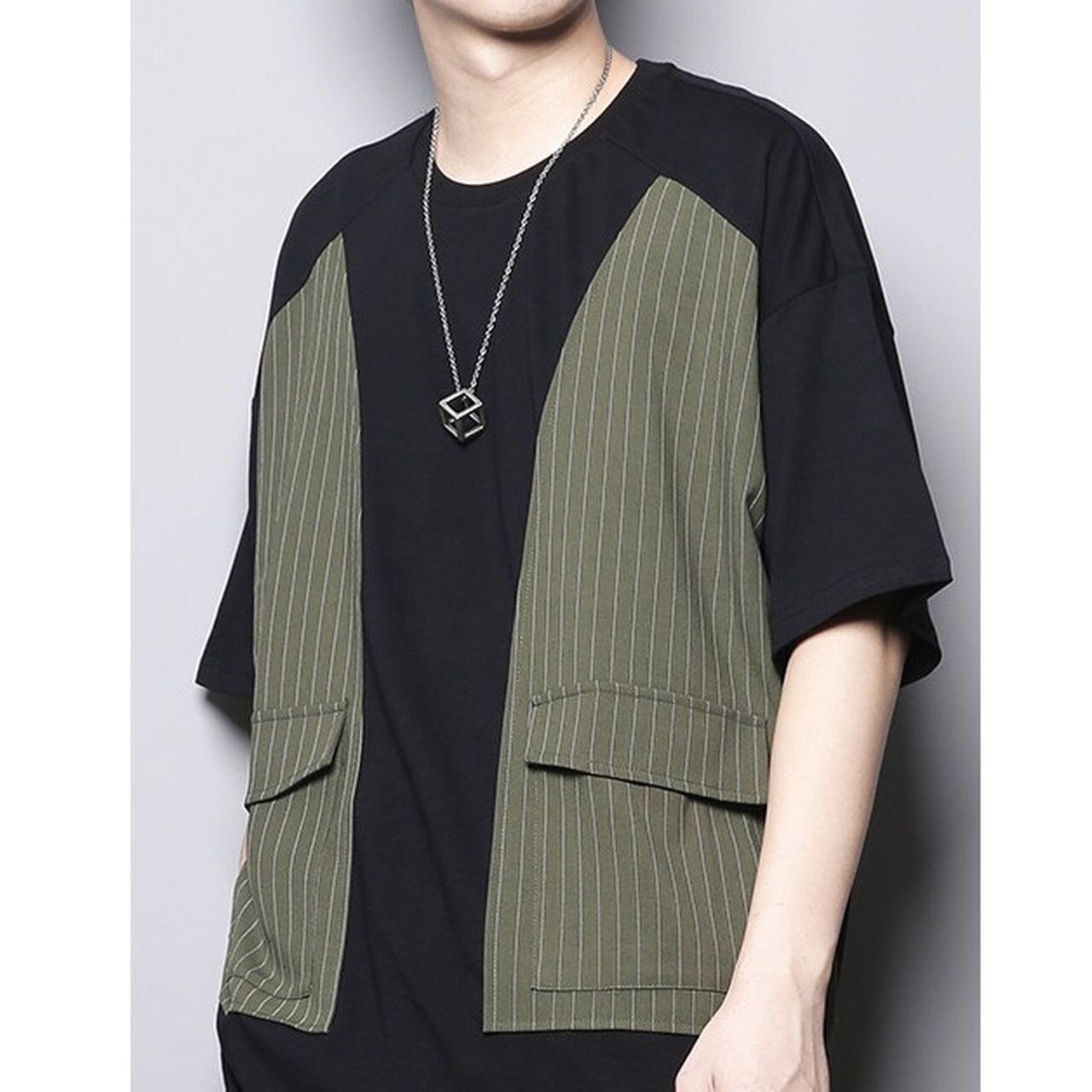 Striped patchwork crew neck short-sleeved T-shirt(MT1487)